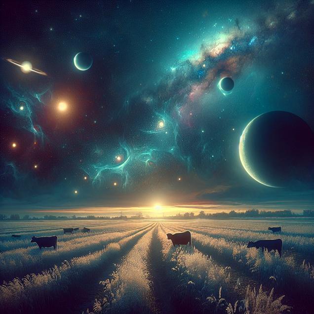 ChatGPT: Generate an image that captures the eerie beauty of a rural Illinois field at night, with the planets Uranus and Saturn dominating the landscape. A faint shimmering in the air highlights their distance from each other. In the distance, UFOs slip through a temporary wormhole, swirling around startled cows before disappearing into the depths of the universe. The overall scene should evoke a sense of wonder and mystery, fitting for a sci-fi fantasy setting.