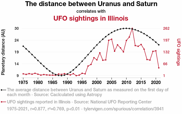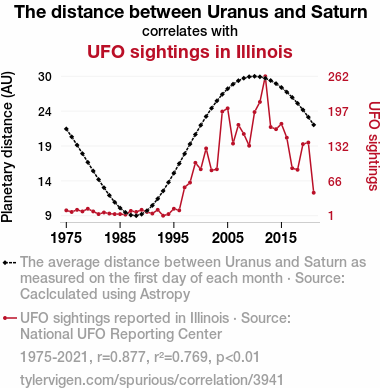 This means 76.9% of the change in the one variable (i.e., UFO sightings in Illinois) is predictable based on the change in the other (i.e., The distance between Uranus and Saturn) over the 47 years from 1975 through 2021.