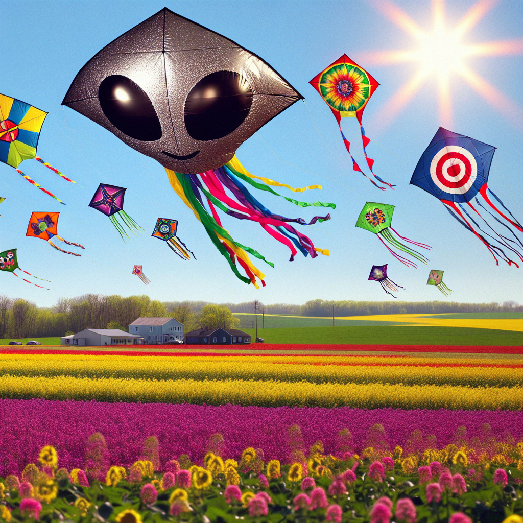 ChatGPT: Generate an image of a comical scene in Ohio, where vibrant homemade kites with metallic embellishments soar through the sky above a colorful field. Each kite depicts the whimsical name "Kenzie," a beloved choice among local children. As sunlight catches the kites, they emit glints that bear an uncanny resemblance to UFOs, sparking a frenzy of reported sightings in the area.