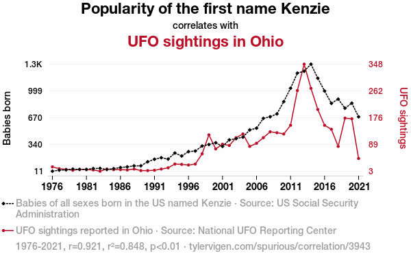 This means 84.8% of the change in the one variable (i.e., UFO sightings in Ohio) is predictable based on the change in the other (i.e., Popularity of the first name Kenzie) over the 46 years from 1976 through 2021.