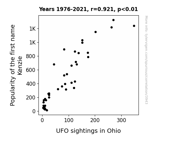 This study delves into the statistical relationship between the popularity of the first name Kenzie and the incidence of unidentified flying object (UFO) sightings in Ohio. By harnessing data from the US Social Security Administration regarding the frequency of the name Kenzie and cross-referencing it with reports from the National UFO Reporting Center, we aimed to unravel the enigmatic connection that seemed to hover in the zeitgeist. The analysis covered a span of 45 years from 1976 to 2021.