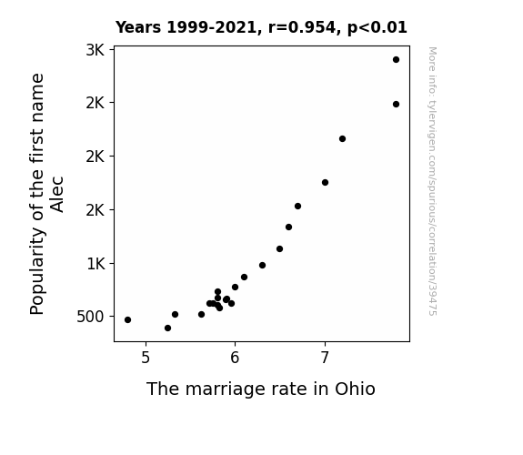 This means 91% of the change in the one variable (i.e., The marriage rate in Ohio) is predictable based on the change in the other (i.e., Popularity of the first name Alec) over the 23 years from 1999 through 2021.