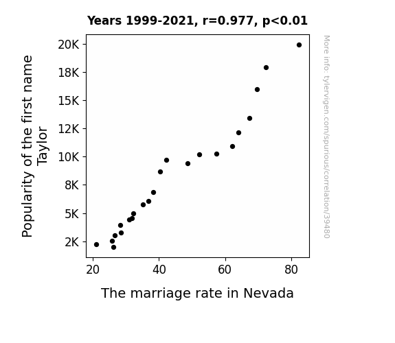 This means 95.5% of the change in the one variable (i.e., The marriage rate in Nevada) is predictable based on the change in the other (i.e., Popularity of the first name Taylor) over the 23 years from 1999 through 2021.