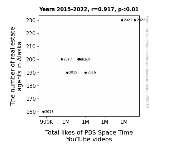 This means 84.2% of the change in the one variable (i.e., Total likes of PBS Space Time YouTube videos) is predictable based on the change in the other (i.e., The number of real estate agents in Alaska) over the 8 years from 2015 through 2022.
