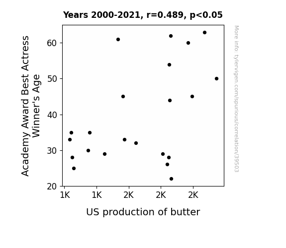 This means 23.9% of the change in the one variable (i.e., US production of butter) is predictable based on the change in the other (i.e., Academy Award Best Actress Winner's Age) over the 22 years from 2000 through 2021.