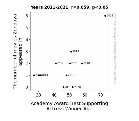 This means 43.4% of the change in the one variable (i.e., Academy Award Best Supporting Actress Winner Age) is predictable based on the change in the other (i.e., The number of movies Zendaya appeared in) over the 11 years from 2011 through 2021.