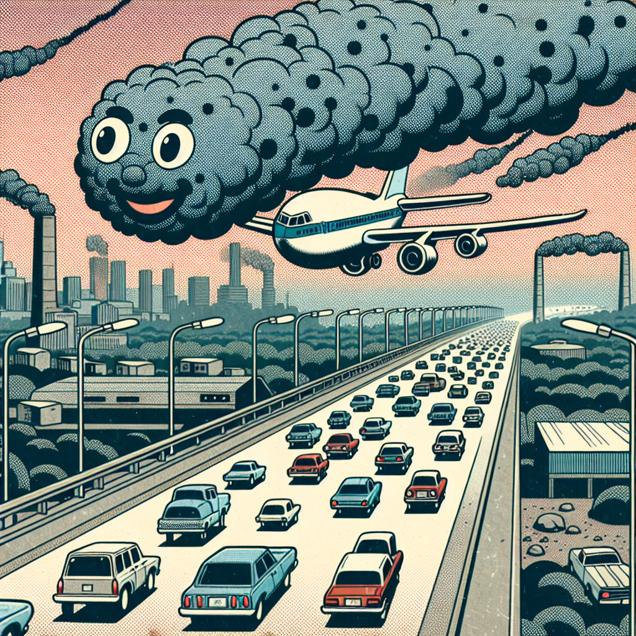 ChatGPT: Generate a comic-book-style illustration with muted colors and a dotted halftone pattern from the 1960s. Depict a scene where in Athens, Tennessee, a dense cloud of smog hovers over the town, with cars and factories emitting thick plumes of smoke. Within this pollution, tiny particles sprout cartoonish eyes and mischievous smiles, as they proudly hijack a commercial airliner passing through the polluted airspace. The pilot looks bewildered as the sentient pollution particles demand to be taken to the U.S. Virgin Islands to start a new life as jet fuel, while a trail of jet fuel emissions can be seen in the background. Ensure that the visual depiction is simple and does not include any words or speech bubbles. Improve the nuances of the dotted halftone pattern to reflect the 1960s comic book style.