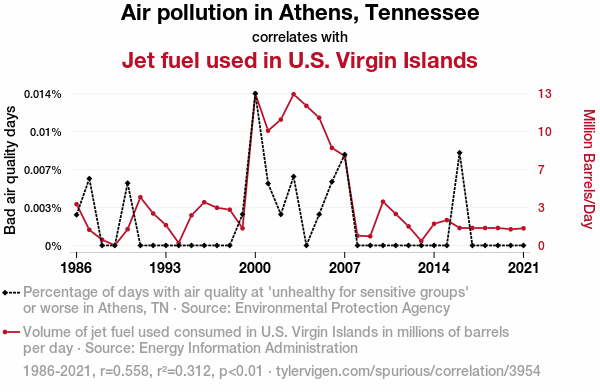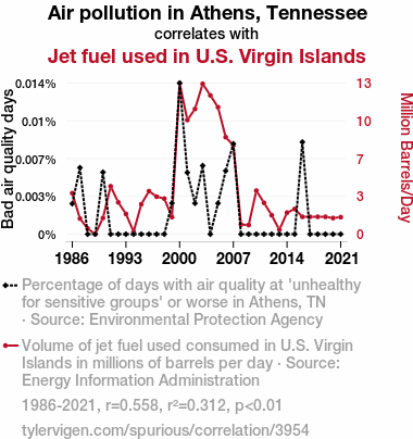 - The spurious research paper: The Sky's the Limit: Unraveling the Air-y Connection Between Air Pollution in Athens, Tennessee and Jet Fuel in U.S. Virgin Islands