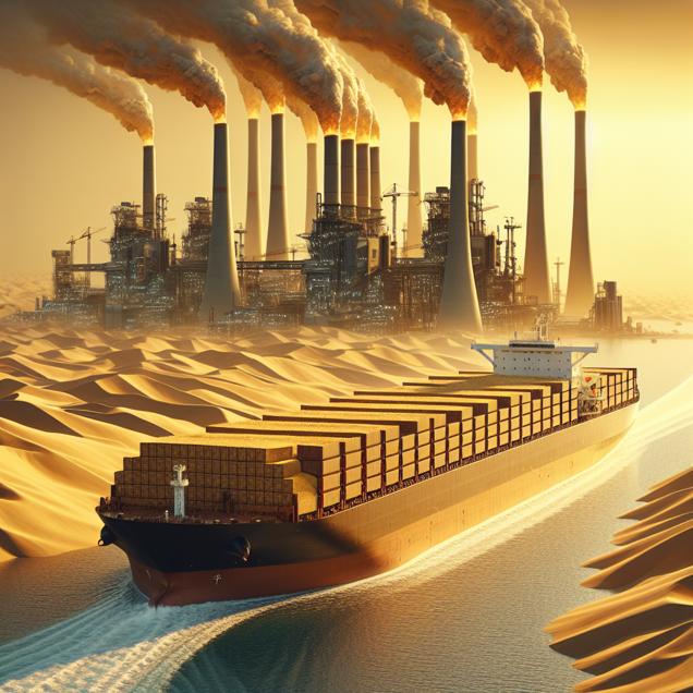 Prompt: [Patriotism] Imagine a colossal cargo ship laden with golden U.S. grains gliding toward the horizon. In the distance, a sprawling power plant in Qatar stands amidst the desert, its smokestacks reaching to the sky. The ship and the power plant are joined by an unseen thread, embodying the reciprocal bond between the grain-laden vessel and the burgeoning biomass power industry in Qatar. The depiction should include only scenes, people, and objects, it should not include text or speech bubbles.