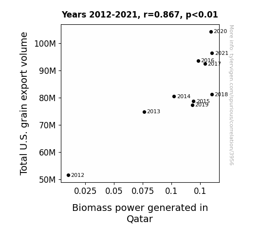 Drawing on data from Statista and the Energy Information Administration, we traded our lab coats for statistical analysis and unearthed a correlation coefficient of 0.8666606 and a p-value of less than 0.01 for the period from 2012 to 2021. Talk about a *corn-y* statistic! This statistical association indicates a strong positive linear relationship between U.S. grain exports and Biomass power generation in Qatar. It's as clear as day: when it comes to this relationship, we certainly didn't *kernel* the details.