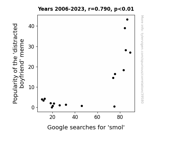 This means 62.4% of the change in the one variable (i.e., Google searches for 'smol') is predictable based on the change in the other (i.e., Popularity of the 'distracted boyfriend' meme) over the 18 years from 2006 through 2023.