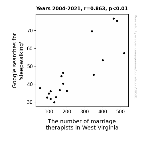 This means 74.5% of the change in the one variable (i.e., The number of marriage therapists in West Virginia) is predictable based on the change in the other (i.e., Google searches for 'sleepwalking') over the 18 years from 2004 through 2021.