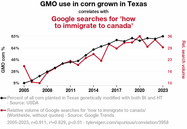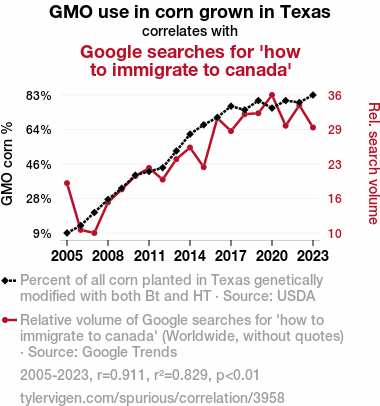 This means 82.9% of the change in the one variable (i.e., Google searches for 'how to immigrate to canada') is predictable based on the change in the other (i.e., GMO use in corn grown in Texas) over the 19 years from 2005 through 2023.