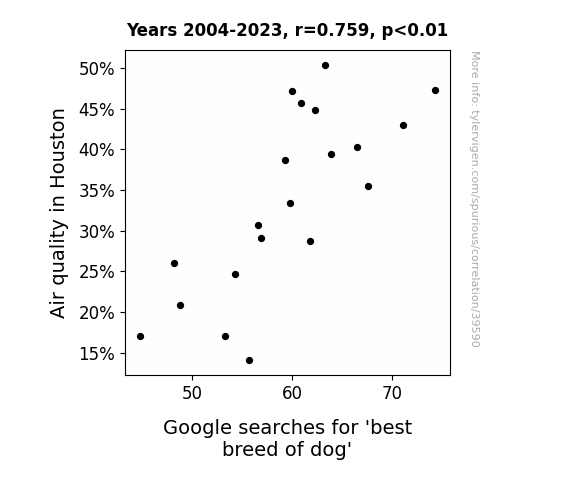 This means 57.6% of the change in the one variable (i.e., Google searches for 'best breed of dog') is predictable based on the change in the other (i.e., Air quality in Houston) over the 20 years from 2004 through 2023.