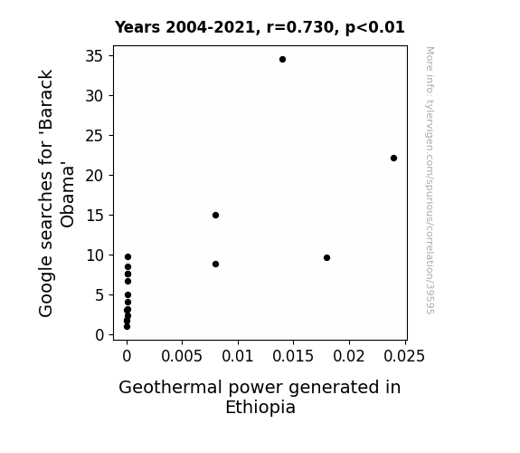 This means 53.3% of the change in the one variable (i.e., Geothermal power generated in Ethiopia) is predictable based on the change in the other (i.e., Google searches for 'Barack Obama') over the 18 years from 2004 through 2021.
