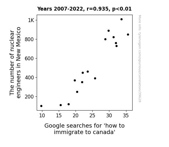 This means 87.5% of the change in the one variable (i.e., Google searches for 'how to immigrate to canada') is predictable based on the change in the other (i.e., The number of nuclear engineers in New Mexico) over the 16 years from 2007 through 2022.