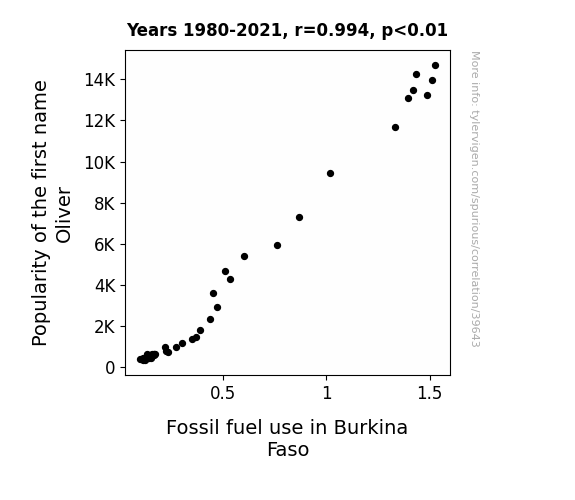 This means 98.9% of the change in the one variable (i.e., Fossil fuel use in Burkina Faso) is predictable based on the change in the other (i.e., Popularity of the first name Oliver) over the 42 years from 1980 through 2021.