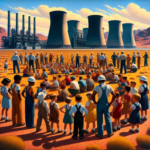 ChatGPT: Create an image of a group of children named Maci, all gathered in a vast field, their gazes fixed on towering power plant structures. The Arizona landscape is vibrant with the desert sun casting long shadows. Engineers in overalls and hard hats are busily working around the machinery. The children are filled with awe and excitement, dreaming of becoming skilled power plant operators like MacGyver. The scene captures the blend of youthful enthusiasm and the industrial ambiance of the desert town.