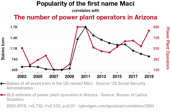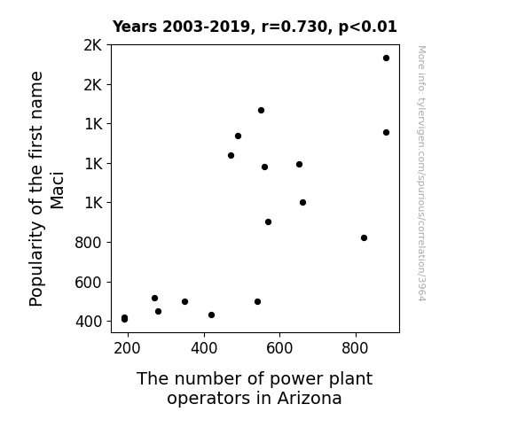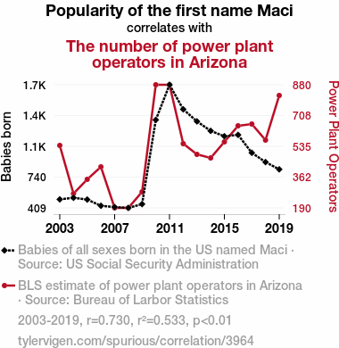 - The spurious research paper: The Maci Power: Exploring the Correlation Between the Popularity of the Name Maci and the Number of Power Plant Operators in Arizona