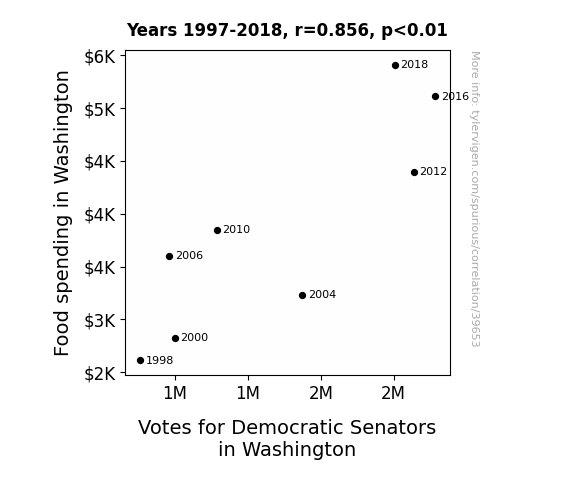 This means 73.3% of the change in the one variable (i.e., Votes for Democratic Senators in Washington) is predictable based on the change in the other (i.e., Food spending in Washington) over the 8 years from 1997 through 2018.