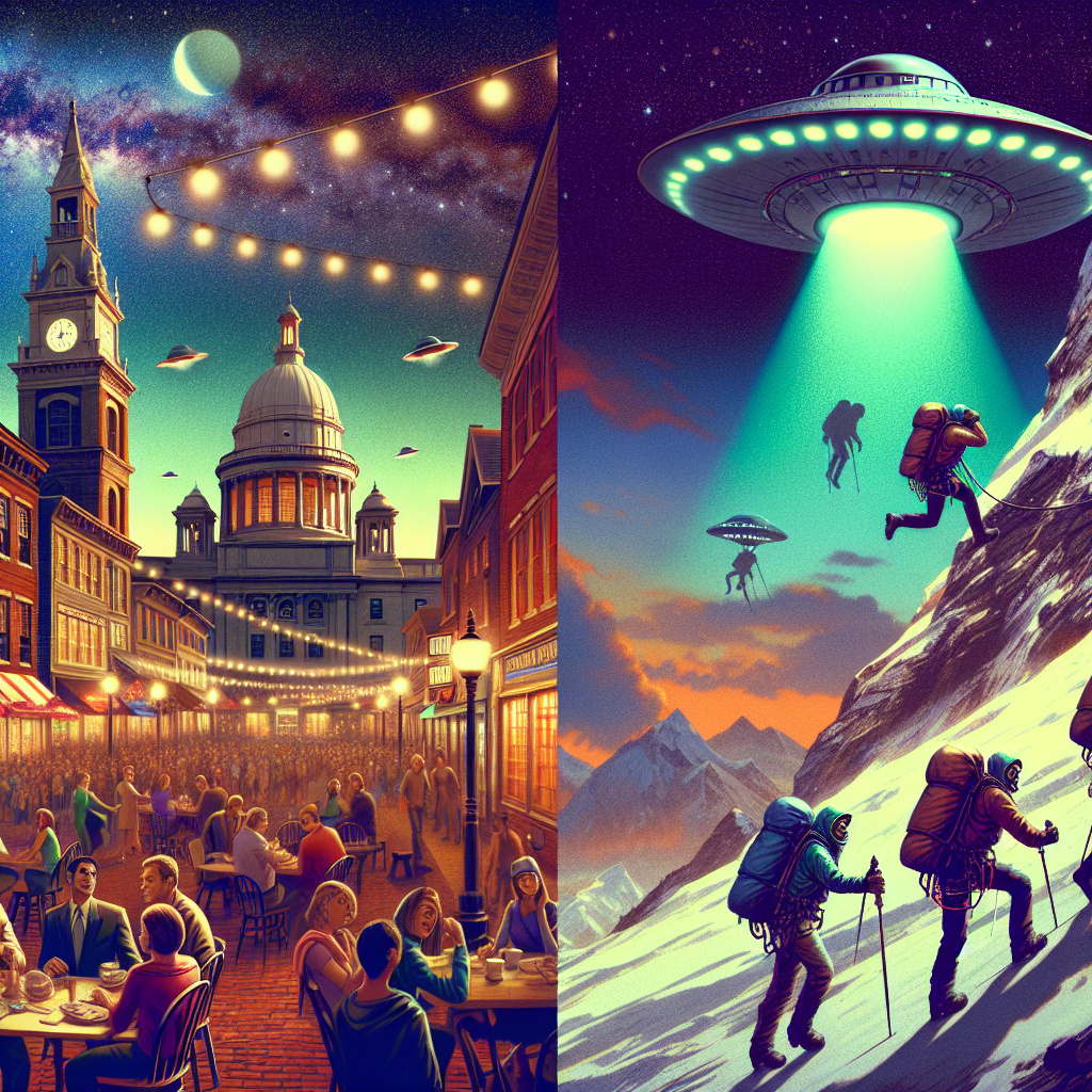 Prompt: "Create an image of a vibrant town square in Rhode Island at night, where people gather to gaze in excitement at a mysterious UFO hovering above, while in the background, determined climbers make their way toward the summit of Mount Everest, inspired by the newfound sense of adventure sparked by the UFO sightings." The depiction should include only scenes, people, and objects, it should not include text or speech bubbles.