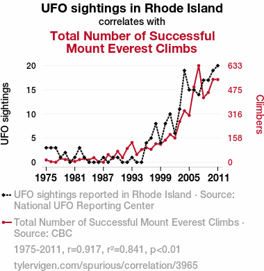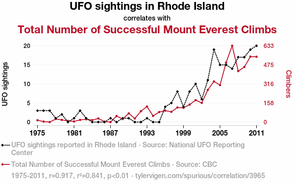 A linear line chart with years as the X-axis and two variables on the Y-axis. The first variable is UFO sightings in Rhode Island and the second variable is Total Number of Successful Mount Everest Climbs.  The chart goes from 1975 to 2011, and the two variables track closely in value over that time. Small Image