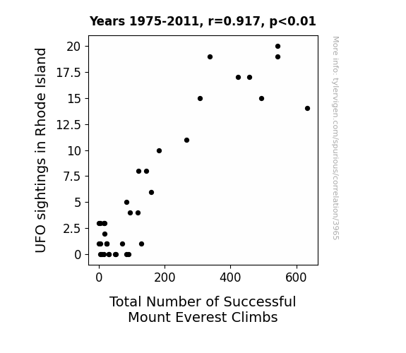 This means 84.1% of the change in the one variable (i.e., Total Number of Successful Mount Everest Climbs) is predictable based on the change in the other (i.e., UFO sightings in Rhode Island) over the 37 years from 1975 through 2011.