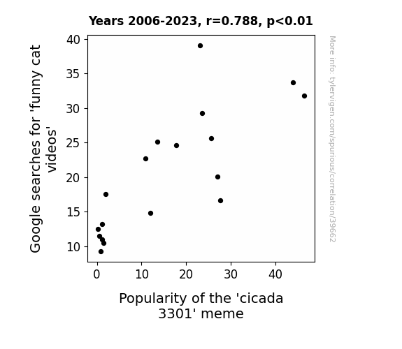 This means 62.1% of the change in the one variable (i.e., Popularity of the 'cicada 3301' meme) is predictable based on the change in the other (i.e., Google searches for 'funny cat videos') over the 18 years from 2006 through 2023.