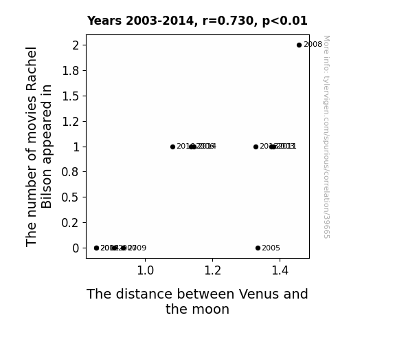 This means 53.3% of the change in the one variable (i.e., The distance between Venus and the moon) is predictable based on the change in the other (i.e., The number of movies Rachel Bilson appeared in) over the 12 years from 2003 through 2014.
