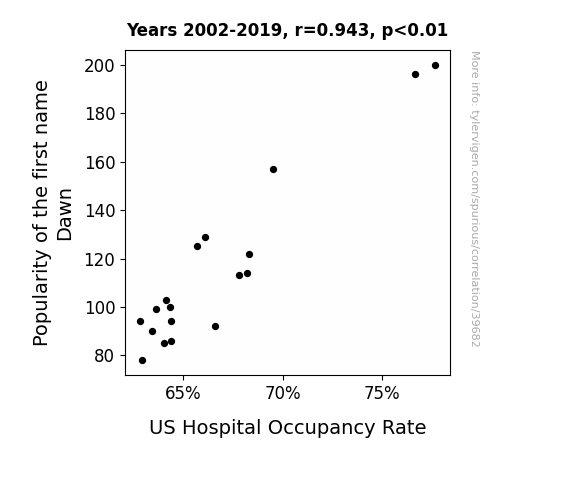 This means 89% of the change in the one variable (i.e., US Hospital Occupancy Rate) is predictable based on the change in the other (i.e., Popularity of the first name Dawn) over the 18 years from 2002 through 2019.