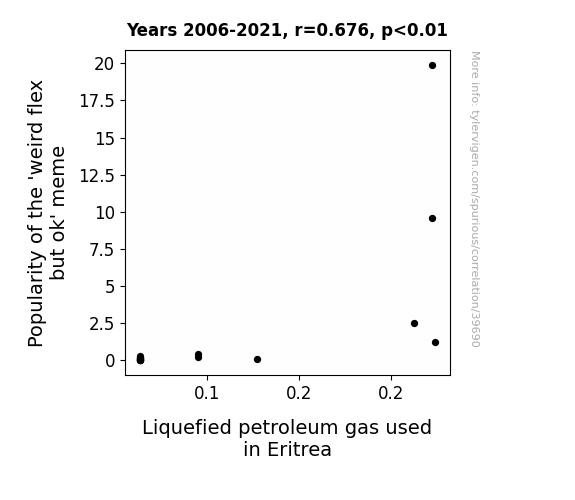 This means 45.7% of the change in the one variable (i.e., Liquefied petroleum gas used in Eritrea) is predictable based on the change in the other (i.e., Popularity of the 'weird flex but ok' meme) over the 16 years from 2006 through 2021.