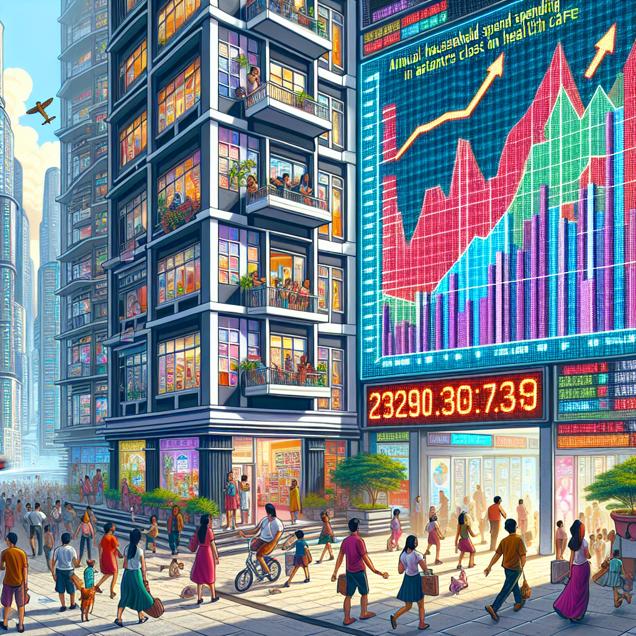 User prompt: Please describe a visual scene that prominently depicts both Annual US household spending on healthcare and AvalonBay Communities' stock price (AVB), in the following situation: Because as household spending on healthcare increases, more people seek medical care, leading to a higher demand for apartments near healthcare facilities. AvalonBay Communities, as a leading provider of such apartments, experiences an increase in demand for their properties, thus driving up their stock price. It's a real "sick" investment opportunity!. Keep the description simple.