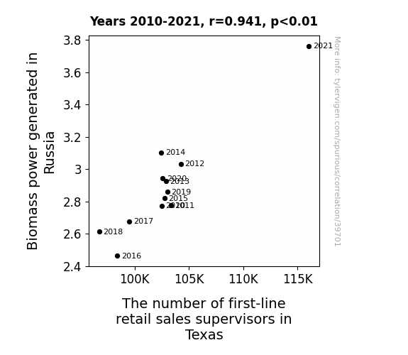 This means 88.5% of the change in the one variable (i.e., The number of first-line retail sales supervisors in Texas) is predictable based on the change in the other (i.e., Biomass power generated in Russia) over the 12 years from 2010 through 2021.