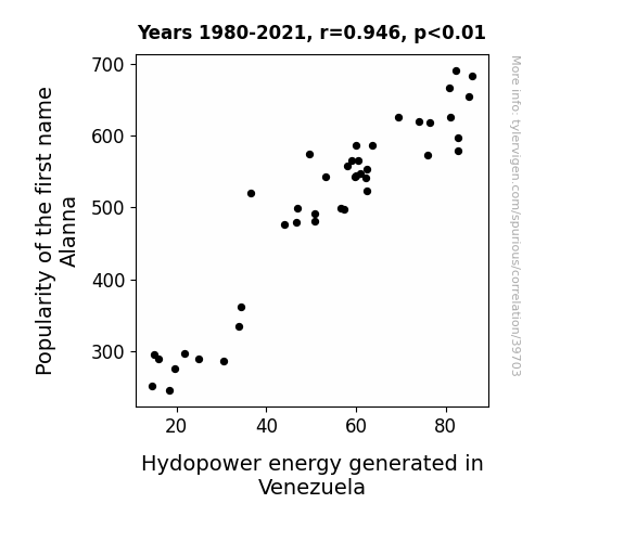 This means 89.4% of the change in the one variable (i.e., Hydopower energy generated in Venezuela) is predictable based on the change in the other (i.e., Popularity of the first name Alanna) over the 42 years from 1980 through 2021.