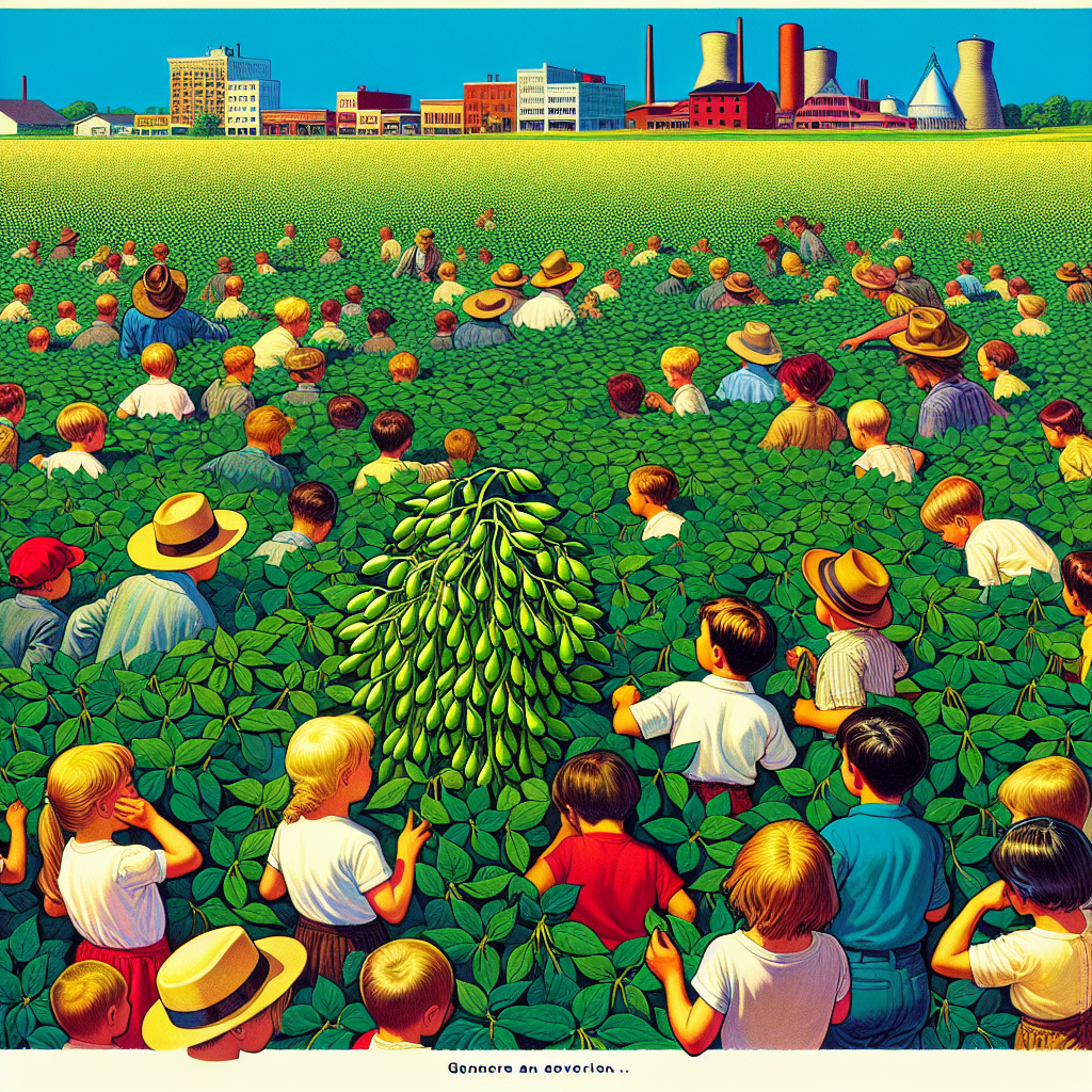 ChatGPT: Generate an image of a South Dakota field filled with lush, vibrant green soybean plants, stretching endlessly into the horizon. Among them, a group of genetically modified soybeans stand out with plumper pods and lusher leaves, radiating a noticeable aura. In the nearby town, a cluster of smiling babies named Rylee play joyfully in a park, basking in their fame and attention. The scene should exude a pop art style, capturing the unique personalities of both the soybeans and the Rylees as they each seek to make their mark in the world.