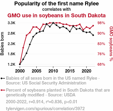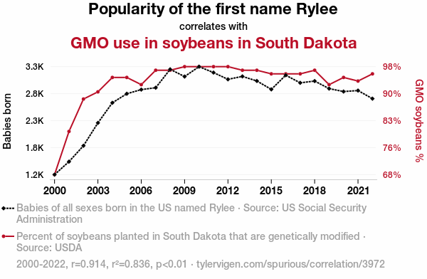 This means 83.6% of the change in the one variable (i.e., GMO use in soybeans in South Dakota) is predictable based on the change in the other (i.e., Popularity of the first name Rylee) over the 23 years from 2000 through 2022.