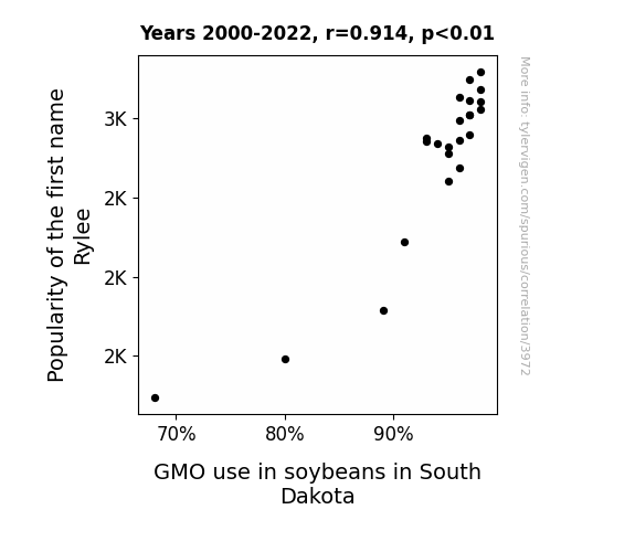 Fig. 1 shows a scatterplot illustrating the striking correlation between Rylee's growing popularity as a first name and the escalating use of GMO soybeans in South Dakota. We must admit, it's quite a sight to behold – just like witnessing a robust soybean plant flourishing in the heart of a bustling city!