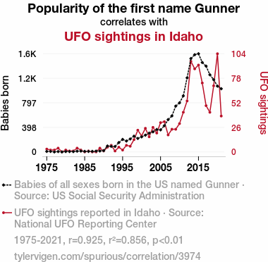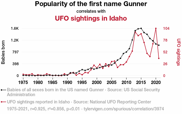 User prompt: Please make up a funny explanation for how an increase in Popularity of the first name Gunner caused UFO sightings in Idaho to increase.\Make it sound serious until the end.