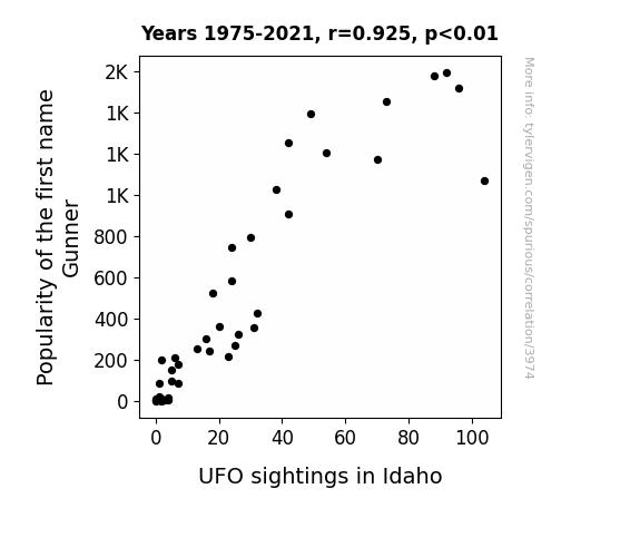This means 85.6% of the change in the one variable (i.e., UFO sightings in Idaho) is predictable based on the change in the other (i.e., Popularity of the first name Gunner) over the 47 years from 1975 through 2021.