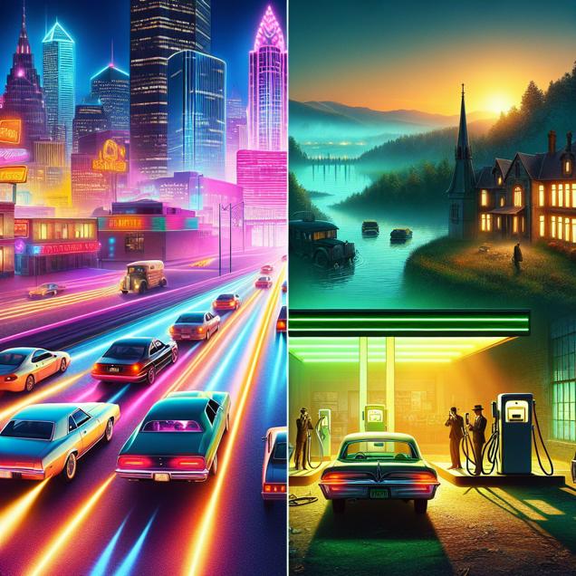 Prompt: Generate an image of a surreal, vibrant landscape split in two halves. On one side stands a row of sleek, stolen cars with blazing headlights, racing through a neon-soaked Tennessee city. The cars leave trails of vivid light behind them as they speed away, creating a sense of frenetic movement and excitement. On the other side, set against a backdrop of an idyllic Belgian countryside, an old-fashioned gas station is surrounded by a queue of patient cars. The station is bathed in a soft, hazy glow, exuding a tranquil atmosphere. In the distance, a group of enigmatic, shadowy figures are depicted siphoning gasoline from a hidden tanker, their sly grins adding an air of mischievousness to the scene. The contrast between the chaotic energy of the stolen cars in Tennessee and the serene, unsuspecting scene in Belgium brings out the stark disparities in the cross-country caper, creating a compelling visual narrative. The depiction should include only scenes, people, and objects, it should not include text or speech bubbles.