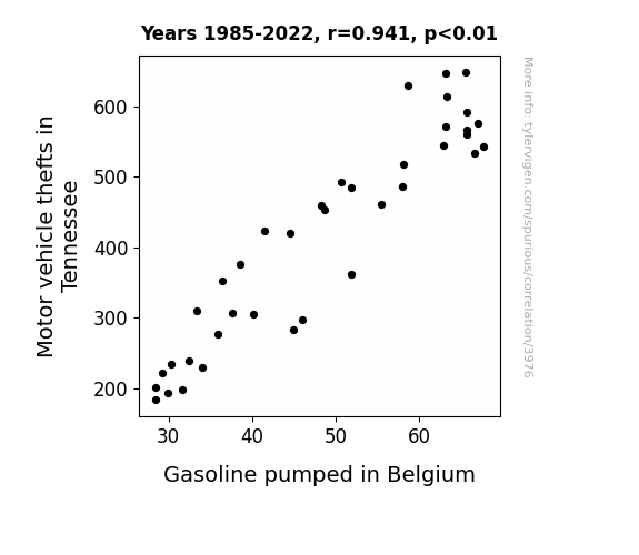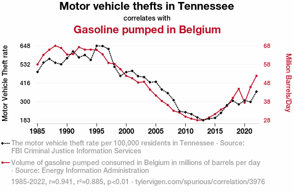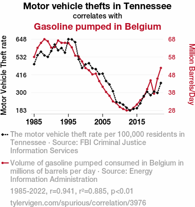 - The spurious research paper: Pump It Up: Exploring the Surprising Relationship Between Motor Vehicle Thefts in Tennessee and Gasoline Pumped in Belgium