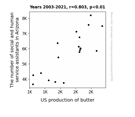 This means 64.4% of the change in the one variable (i.e., US production of butter) is predictable based on the change in the other (i.e., The number of social and human service assistants in Arizona) over the 19 years from 2003 through 2021.