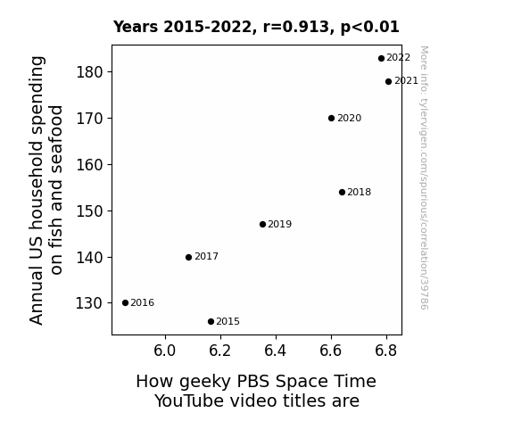 This means 83.4% of the change in the one variable (i.e., How geeky PBS Space Time YouTube video titles are) is predictable based on the change in the other (i.e., Annual US household spending on fish and seafood) over the 8 years from 2015 through 2022.