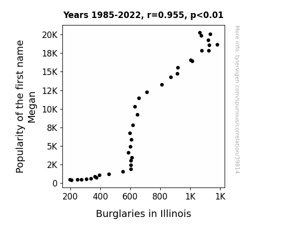 This means 91.1% of the change in the one variable (i.e., Burglaries in Illinois) is predictable based on the change in the other (i.e., Popularity of the first name Megan) over the 38 years from 1985 through 2022.