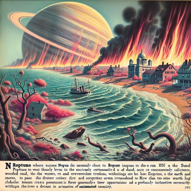 ChatGPT: Generate an image that appears to be a scene from a Disney movie, featuring Neptune orbiting closer to the Sun and the Earth with rising water levels along its shores. Show fewer areas of dry vegetation on the land as water encroaches onto previously dry areas. In Rhode Island, depict fewer opportunities for potential arsonists to start fires due to the reduced availability of dry land, resulting in a decrease in arson incidents. Create a visually stunning and ethereal representation of these environmental changes within a dreamlike Disney-style setting.