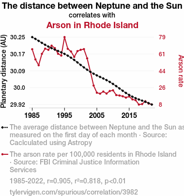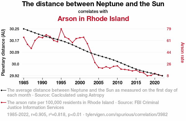 This means 81.8% of the change in the one variable (i.e., Arson in Rhode Island) is predictable based on the change in the other (i.e., The distance between Neptune and the Sun) over the 38 years from 1985 through 2022.