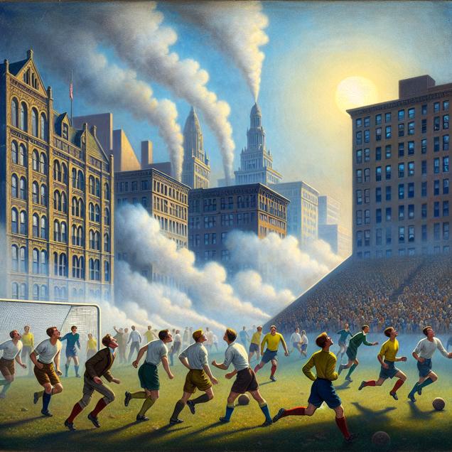 ChatGPT: Generate an image that illustrates the scene of soccer players on a field in Cleveland, Tennessee, with the smog lifting to reveal clear skies. Capture the players taking deep breaths of fresh air and feel revived as they play in the FA Cup final. Emphasize the players charging towards the goal with renewed energy and enthusiasm, scoring goals and closing the goal difference. Show a clear distinction between the smoggy environment and the newfound clarity and energy on the field.