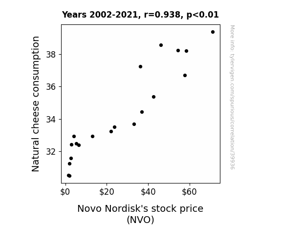 This means 88.1% of the change in the one variable (i.e., Novo Nordisk's stock price (NVO)) is predictable based on the change in the other (i.e., Natural cheese consumption) over the 20 years from 2002 through 2021.