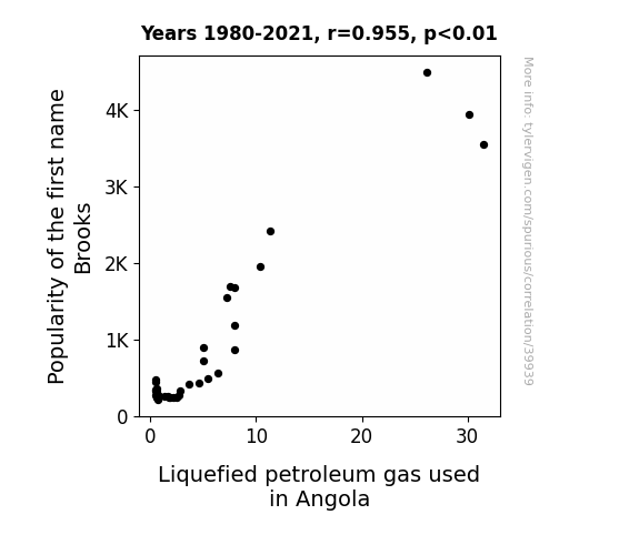 This means 91.1% of the change in the one variable (i.e., Liquefied petroleum gas used in Angola) is predictable based on the change in the other (i.e., Popularity of the first name Brooks) over the 42 years from 1980 through 2021.