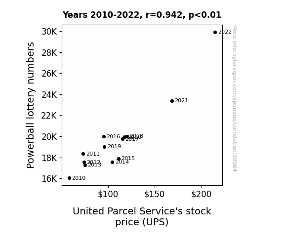 This means 88.8% of the change in the one variable (i.e., United Parcel Service's stock price (UPS)) is predictable based on the change in the other (i.e., Powerball lottery numbers) over the 13 years from 2010 through 2022.